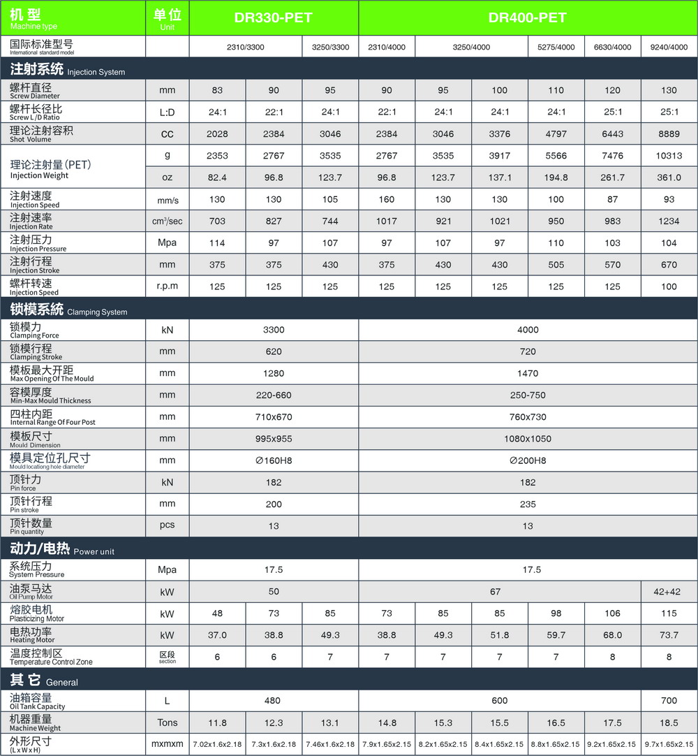 5、动力配置加大,提高电机过载能力和油泵排量输出,达到真正意义上的高速PET专用机。